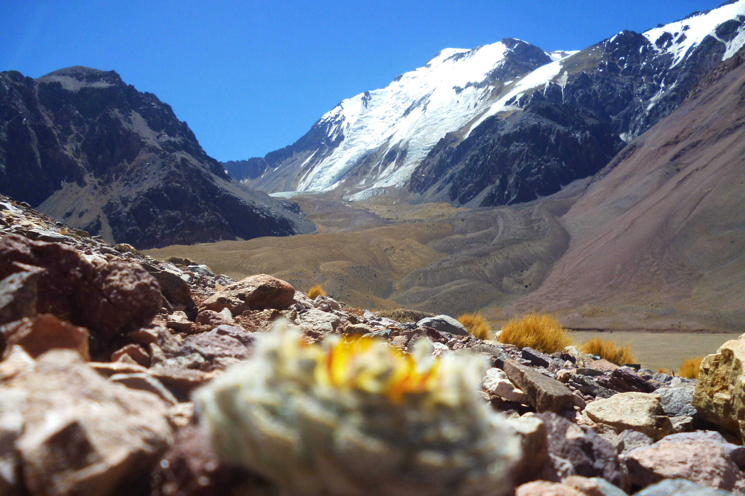 Extraída en Enero de 2015 en la base del Cerro Mercedario sobre el valle del Río Colorado, Provincia de San Juan, coordenada aproximada: 32°01’02»S y 70°02’18»O (3670 msnm). En la foto se observa también el Cerro Mercedario pero mirándolo desde otro valle. Esos cerros imponentes a la derecha son los famosos seismiles que separan el Río Colorado (donde estamos parados en la foto) del Arroyo Laguna Blanca de la foto anterior. Fuera de foco vemos una suculenta en flor que enmarca la vista del glaciar de escombros que baja de la pared Sur del Cerro Mercedario.