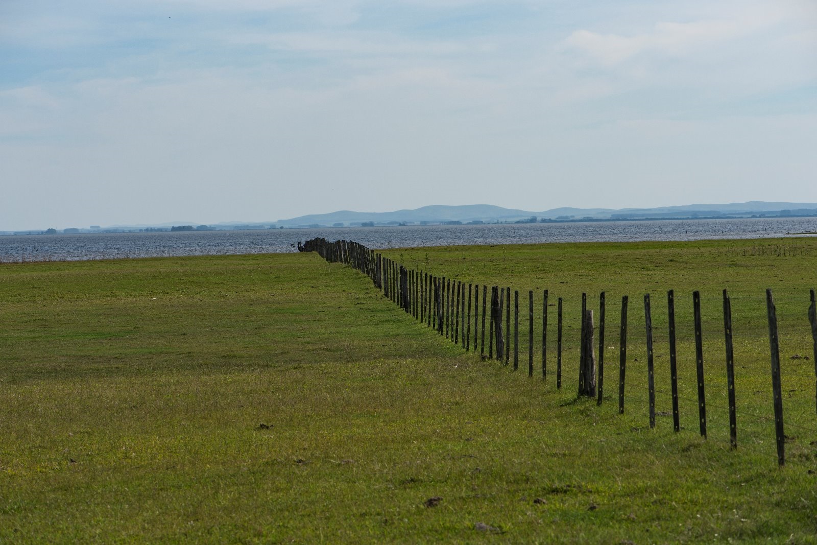 6 de mayo de 2019, 13 pm. Nivel de agua alto en la costa sureste de la Laguna de Castillos, Rocha, Uruguay. Alambrados que ingresan al agua, lo que indica el máximo aprovechamiento de la superficie de pastoreo en la cuenca de la Laguna de Castillos.