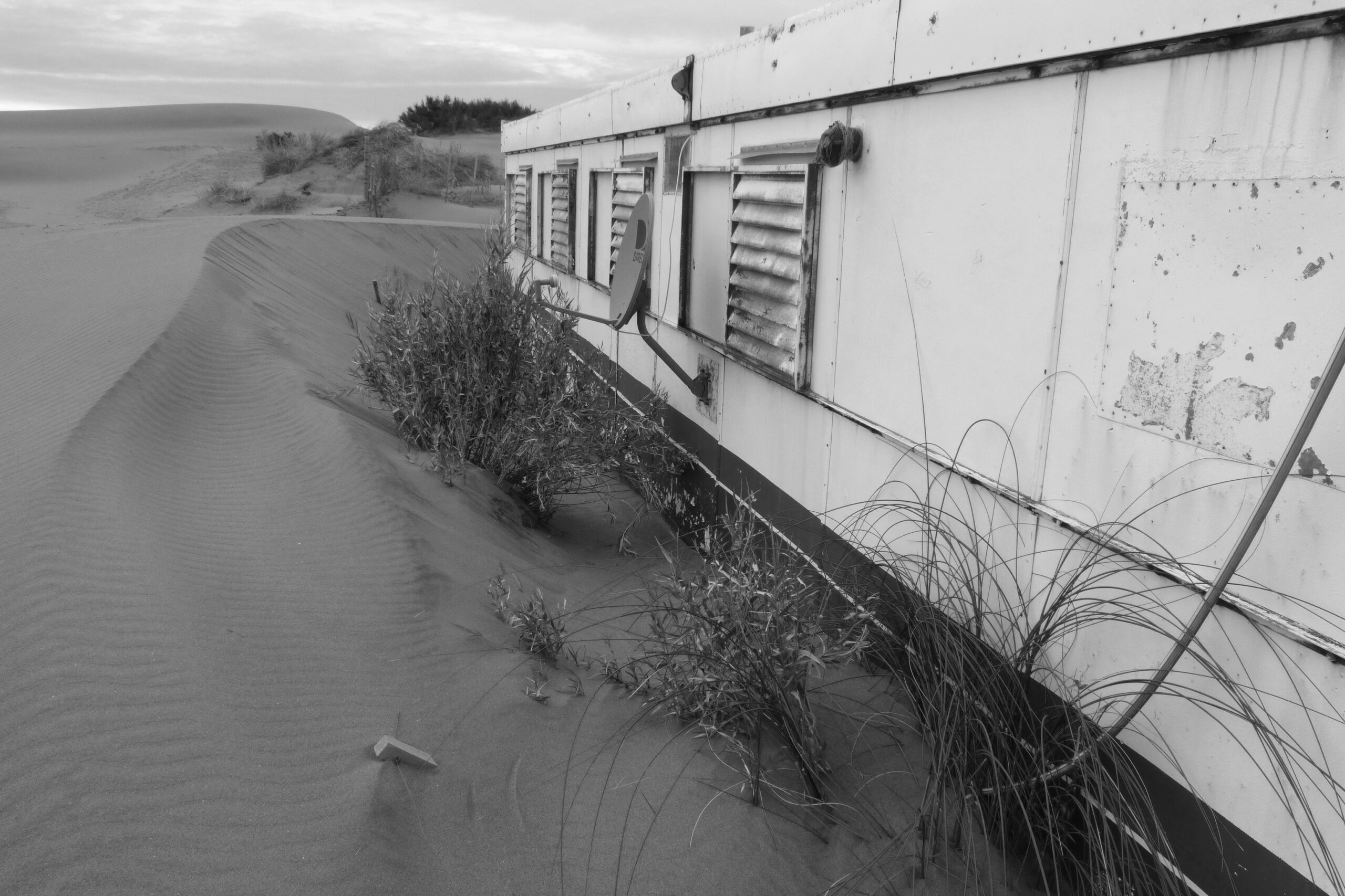 Casilla de veraneo actuando como obstáculo para dar lugar a la formación de una eco duna a la vera de la ruta provincial N°1 de Río Negro, en la localidad costera de Bahía Creek. La fotografía fue tomada en mayo de 2017.